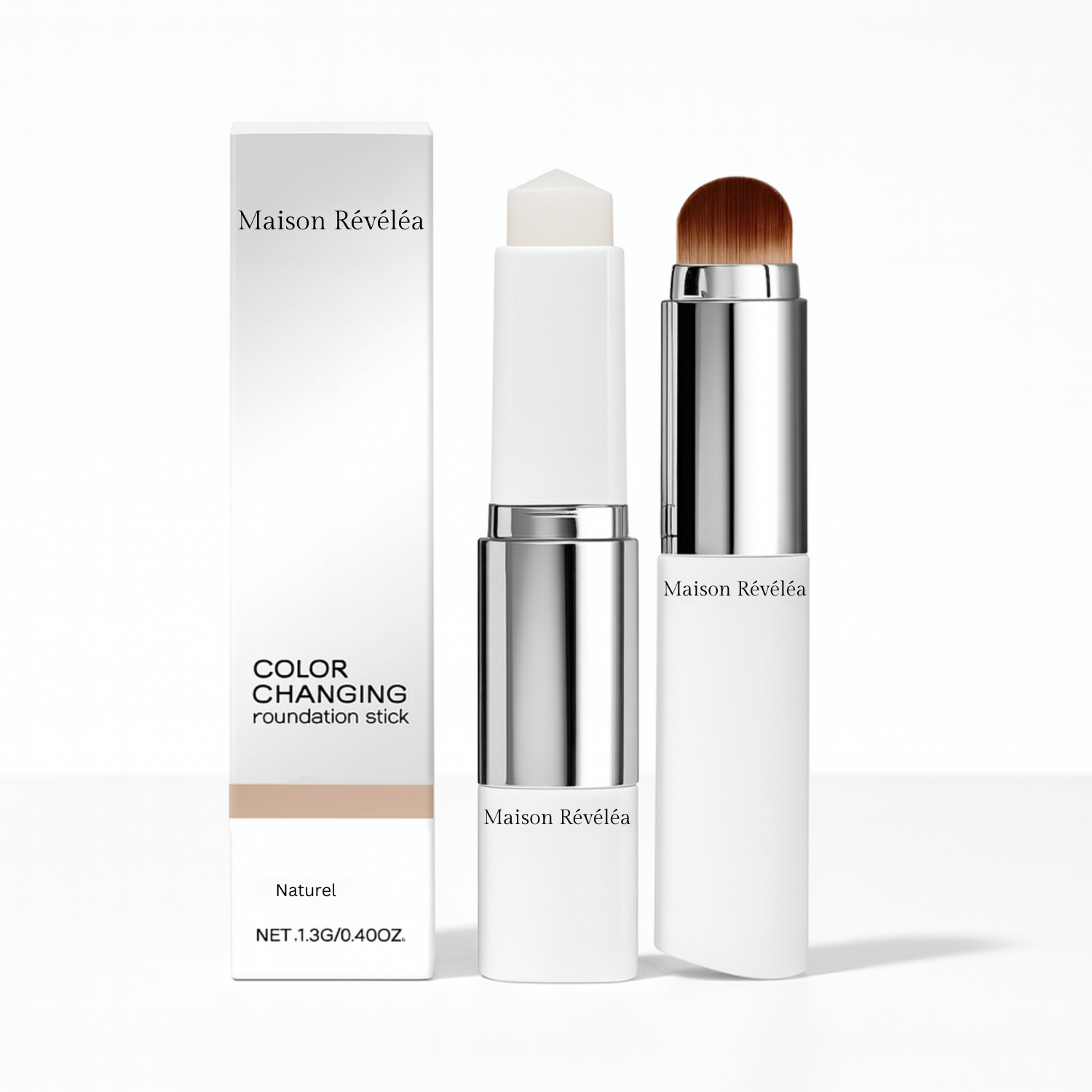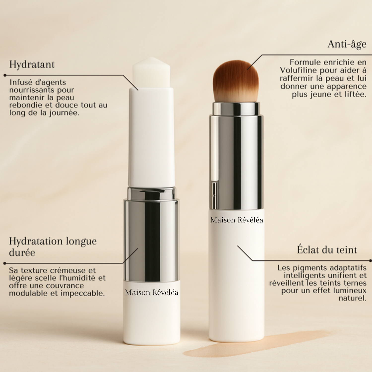 Le Fond de teint 2-en-1 by Maison Révéléa réunit soin + maquillage dans un format intelligent et ultra pratique. Sa texture s’applique d’abord en blanc, puis se révèle au contact de la peau grâce à des pigments adaptatifs : en quelques secondes, le teint s’unifie avec un rendu léger, lumineux et naturel (effet “peau nue”).